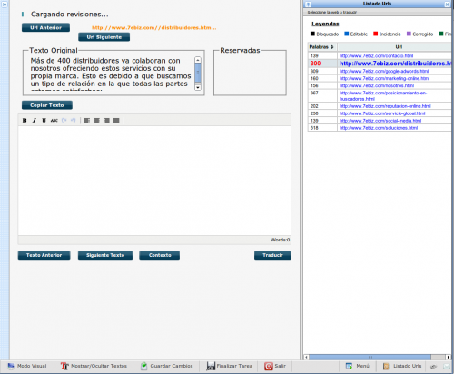 Para ello nuestra herramienta analiza una página web y separa los textos por cada url que tenga y muestra el número de palabras que contiene, de esta forma permite que cada cliente decida que partes de la web quiere traducir en cada momento, indicándolo al traductor profesional que haya elegido para realizar el trabajo.